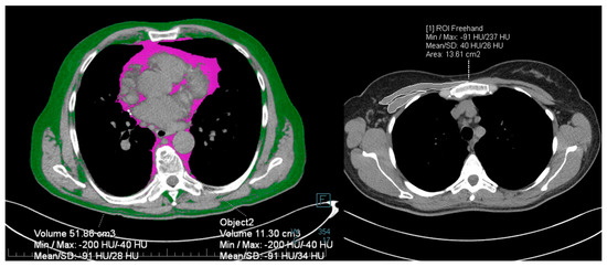 The index thoracic CT scan was used to measure the volume of subcutaneous fat, intrathoracic fat, total fat, pectoral muscle area, and pectoral muscle density. A single radiologist performed the measurements, using the syngo.via VB30A imaging software (Siemens Healthineers, Erlanger, Germany). A single 3-mm slice situated between the seventh and eighth thoracic vertebrae was used to quantify total thoracic and intrathoracic adipose tissue, adapting from a previously described method [22]. A region of interest of the thoracic circumference was contoured manually, and a density range from −200 to −40 HU (Hounsfield Unit) was applied, obtaining the total thoracic fat volume expressed in mm. Intrathoracic fat volume was outlined similarly on the same slice (Figure 1). Extrathoracic adipose tissue volume was obtained by subtracting total thoracic fat and intrathoracic fat. Sarcopenia was evaluated using the pectoralis muscle cross-sectional area (PMA) and mean muscle density (HU). An axial slice located cranially to the aortic arch was selected, applying the density range of −50 to 142 HU. The pectoralis major and minor borders on the right side were manually outlined (Figure 1). To account for the physiological fat-tissue distribution disparity between genders, a separate subgroup analysis was performed for fat-tissue and muscle assessment.