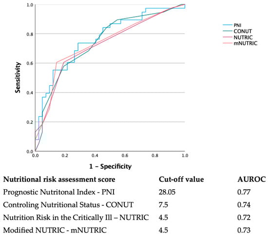 Similar to PNI and CONUT, the reports on NUTRIC and mNUTRIC in COVID-19 have been scarce. If the PNI and CONUT were initially designed for oncological patients and the general population, respectively, the NUTRIC score was specifically designed for the nutritional evaluation of patients expected to stay more than 24 h in the ICU [13]. In response to the relatively low availability of IL-6 in day-to-day practice, Rahman A et al. have proposed an abbreviated version of the score, mNUTRIC, which does not require IL-6 and has been extensively validated since the first report in 2016 [14]. Regarding the NUTRIC and mNUTRIC in severe COVID-19 requiring ICU admission, all reports were concordant, suggesting that higher scores accurately predict higher mortality [38,39,40,41]. Furthermore, there is evidence that mNUTRIC effectively predicts mortality in other clinical entities associated with acute respiratory failure, such as community-acquired pneumonia [42]. Our findings follow the same trendline, as deceased patients had significantly higher NUTRIC and mNUTRIC scores. Furthermore, according to our dataset, there was no substantial gain in the predictive prowess due to the use of IL-6, as mNUTRIC even had slightly better discrimination metrics, with an AUROC of 0.73 versus 0.72 for NUTRIC, using the same cut-off value of 4.5.