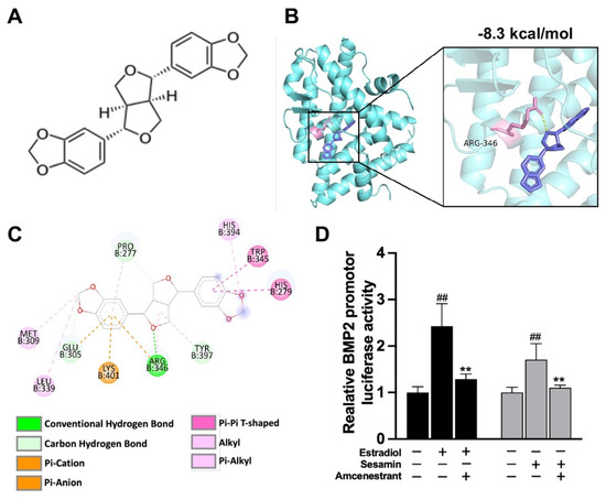 Sesamin exhibited high binding affinity to Erα: (A) Molecular structure of sesamin. (B) Three-dimensional structure of the predicted interaction structural model between sesamin and the ligand binding pocket of ERα. Sesamin was violet colored. Side chains in ERα were pink colored (C) Predictions of various binding forces between sesamin and residuals of ligand binding pocket of ERα. (D) Luciferase activity of BMP2 promotor reporter system upon treatment of sesamin, estradiol and ERα inhibitor amcenestrant in vitro (n = 6; ## p < 0.01 vs. NC group; ** p < 0.01 vs. non-amcenestrant treatment group).