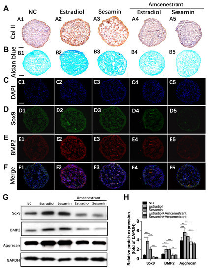 A three-dimensional cell culture system was applied for chondrogenesis assay as described before [22]. Human BMSCs were resuspended at the density of 106 cells/10 μL in 10 μL StemProTM Chondrogenesis Differentiation medium (A1007101, Thermo Fisher, Waltham, MA, USA). The 10-μL droplet was added in the center of the culture wells. After 30 min, another 1 mL chondrogenic induction medium was added to the culture well. The cell spherical aggregate formed subsequently. The estradiol (100 nM) or sesamin (0.5 μM) was supplemented into the medium 3 days after seeding. After 21-day induction, all cell pellets were collected and fixed with 10% formalin for 24 h. Fixed pellets were then dehydrated with 30% saccharose dissolved in formalin. Optimal cutting temperature compounds (OCT, Sakura Finetek, St. Torrance, CA, USA) were used for sample embedding and 7-μm sections were cut by cryostat (Leica, Wetzlar, Germany). Alcian blue staining was applied according to our previous work [21].