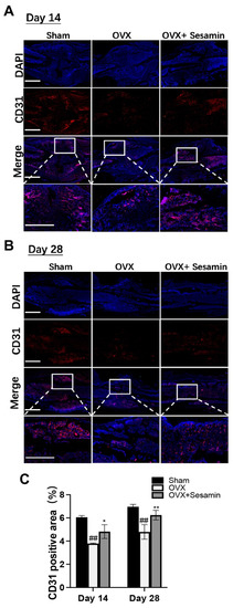Sesamin promoted angiogenesis within callus area in vivo: (A,B) The IF staining of CD31 positive area in each group 14 (A) or 28 days (B) after fracture. (C) Semi-quantitative analysis of CD31 positive area (n = 6; ## p < 0.01 vs. Sham group; * p < 0.05, ** p < 0.01 vs. OVX group).