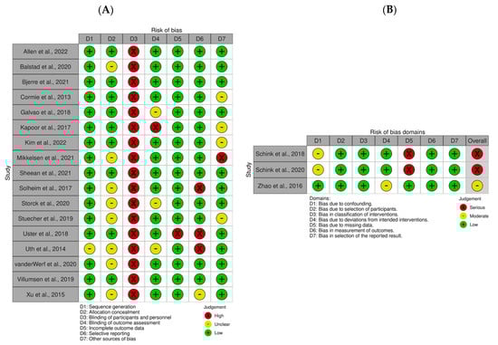 Risk of bias assessments for (A) randomized controlled trials and (B) non-randomized controlled trials. Risk of bias plots were generated using the Risk-of-bias VISualization (robvis) tool [,,,,,,,,,,,,,,,,,,,,].