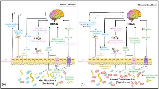 (a) Potential pathways involved in the communication between the gut microbiome and brain (microbiota–gut–brain axis, MGBA). (b) Alterations in gut microbiome (dysbiosis) and MGBA communication in neurodegenerative disorders. Gut microbiome–brain communication occurs mainly via three pathways: (1) neural (vagus and enteric nervous system, neurotransmitters, blue letters), (2) immune (cytokine balance and functional microglia, pink letters), and (3) humoral/metabolic (gut hormones, short-chain fatty acids (SCFAs), and neuropeptides, green letters). Neural communication is established via the vagus nerve and the hypothalamic–pituitary–adrenal (HPA) axis and systemic communication via the immune and humoral/metabolic pathways. In neurodegenerative disorders, the composition and activity of the normal gut microbiome are altered, leading to abnormal microbial metabolite profiles such as altered levels of neurotransmitters and SCFAs. The result is disruption of the neural, immune, and humoral/metabolic pathways and increased risk for disease progression [12,17,19]. The red arrows indicate alterations during dysbiosis (