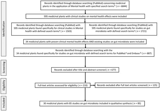 A total of 6844 records were identified from the database searches concerning medicinal plants used for mental health, with 1503 articles related specifically to clinical studies. The second search was for studies of gut microbiota that included the use of these plants with mental health effects, yielding 34 medicinal plants with 887 records. Of these articles, after screening of the title and abstract, 677 were excluded based on the criteria described above (Section 2.1). The remaining 210 full-text articles were further reviewed and screened based on the inclusion criteria, yielding 85 articles on gut microbiome interactions with 30 mental health-related medicinal plants for inclusion in this systematic review. The flowchart of the included studies is depicted in Figure 2.
