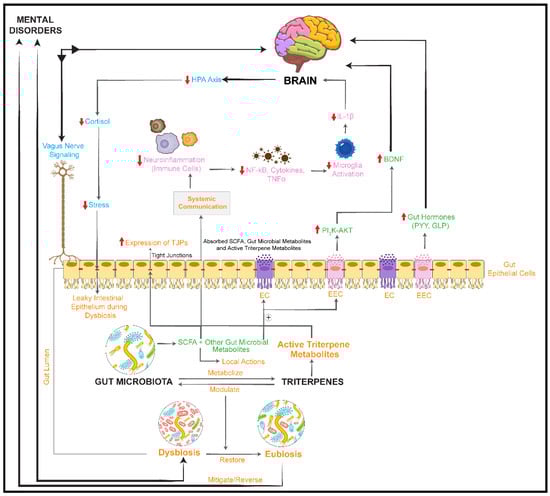 Taken together, as shown in Figure 3, the available data suggest that triterpenes may modulate an imbalanced microbiome–gut–brain communication during impaired brain functions and promote mental health [207,209,210,211,212,213]. G. pentaphyllum, C. asiatica, and P. ginseng exerted prebiotic-like effects and led to a recovered intestinal flora diversity or mitigated gut dysbiosis compared with control groups in rodent models [82,115,116,120,142,144,149].