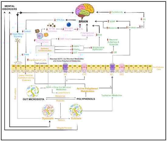 inhibition/downregulation). EC: enterochromaffin cell; EEC: enteroendocrine cell; SCFA: short-chain fatty acid; HPA: hypothalamus–pituitary–adrenal; TNF-α: tumor necrosis factor-α; INF-γ: interferon gamma; IL-6: interleukin-6; IL-1: interleukin-1; GABA: gamma-amino butyric acid. ⊕: stimulates/promotes.