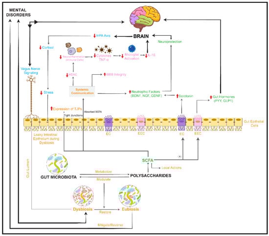It is important to consider the symbiotic relationship between humans and their resident microbes when discussing the role of the gut–brain axis in behavior, health, and disease [4]. The sharp increase in various disease states in recent decades [5,6] could be explained, at least in part, by the changes in modern diets and lifestyles that have negatively impacted the composition and diversity of the human gut microbiome [7]. The gut microbiome could be the missing link in the conceptualization and treatment of psychological disorders [4]. The microbiome–gut–brain axis (MGBA) provides a network for signals from the brain to influence the motor, sensory, and secretory functions of the gut while simultaneously allowing signals and metabolites from the gut microbiome to influence brain development, biochemistry, function, and behavior [8,9,10].