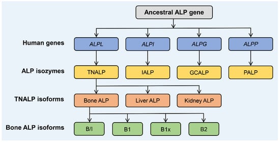 Alkaline phosphatase (ALP; EC 3.1.3.1) is a highly conserved enzyme that catalyzes the hydrolysis of phosphomonoesters, e.g., the endogenous substrate inorganic pyrophosphate (PPi), with an optimum activity at alkaline pH values. Four ALP isozymes are expressed in humans: tissue-nonspecific ALP (TNALP, a.k.a. liver/bone/kidney ALP), intestinal ALP (IALP), placental ALP (PALP, a.k.a. PLAP), and germ cell ALP (GCALP, a.k.a. placental-like ALP). The tissue-specific ALPs (i.e., IALP, PALP, and GCALP) are located on chromosome 2, bands q34.2–q37, with 90–98% sequence identity (Figure 1) []. The TNALP gene ALPL is located on the short arm of chromosome 1, band 1p36.12, with approximately 50% homology to the three tissue-specific ALPs, and it is at least five times larger, mainly due to intron size differences [,,]. As the isozyme name “tissue-nonspecific” implies, TNALP is expressed ubiquitously and modified by post-translational glycosylation processes, to become isoforms that provide significant proteomic diversity and specificity relating to various tissues and cells. The highest levels of human TNALP isoforms are expressed in bone, liver, and kidney tissues []; with neutrophil granulocytes [], brain [], and vascular cells [] as secondary sources of TNALP activity.