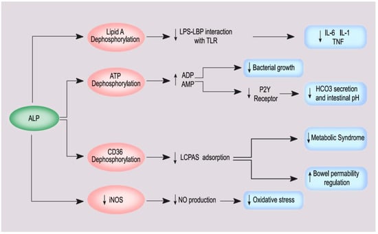 In contrast to the other ALP isozymes, IALP may be protective against CVD, in addition to its protective effect on metabolic syndrome and diabetes discussed above. In fact, a case-control study on 623 patients showed that ischemic heart disease was associated with lower fecal IALP activity []. This could be due to the increase in chronic systemic inflammation, with subsequent endothelial damage, which has previously been observed in studies on IALP-deficient mice.