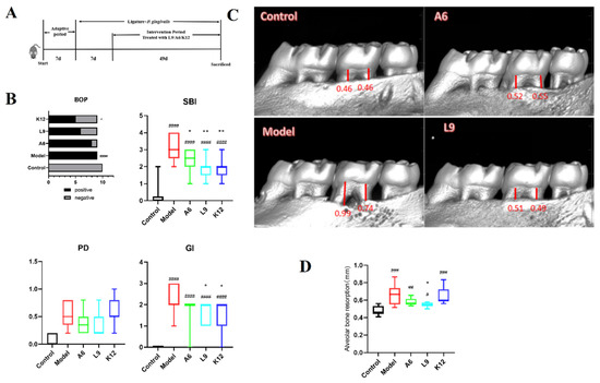 Effects of A6 or L9 administration on the clinical characterization of PD in mice from different groups. (A) Experimental arrangement. (B) Clinical index score—including bleeding upon probing (BOP), sulcus bleeding index (SBI), probing depth (PD), and gingival index (GI). (C) Representative micro-CT appearance of maxillary molars. (D) Micro-CT analysis of alveolar bone resorption in the maxillary second molars. Red bars represent the distance from the cementoenamel junction (CEJ) to the alveolar bone crest (ABC). Values designated with a superscript * reflect comparisons with the model group, and values with a # are in relation to the control group (* p and # p < 0.05; ** p and ## p < 0.01; ### p < 0.001; **** p and #### p < 0.0001).