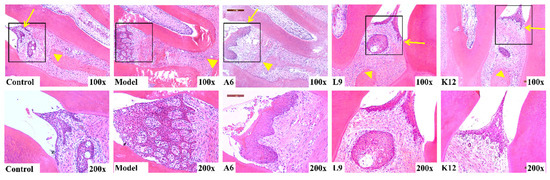 Effects of A6 or L9 administration on the histological changes in periodontal tissues in interproximal areas of the maxillary second molar (H&E staining, magnification, ×100 and ×200; yellow arrows represent CEJ, and yellow triangles represent ABC).