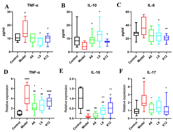 Reduced pro-inflammatory and enhanced anti-inflammatory cytokine expression in A6 or L9 intervention group. (A–C) TNF-α, IL-10, and IL-6 expression in serum as detected by ELISA. (D–F) Relative expression of TNF-α, IL-10, and IL-17 mRNAs in tissues as determined by RT-PCR. Values designated with a superscript * reflect comparisons with the model group, and values with a # are in relation to the control group (* p and # p < 0.05; ** p and ## p < 0.01; ### p < 0.001; #### p < 0.0001).