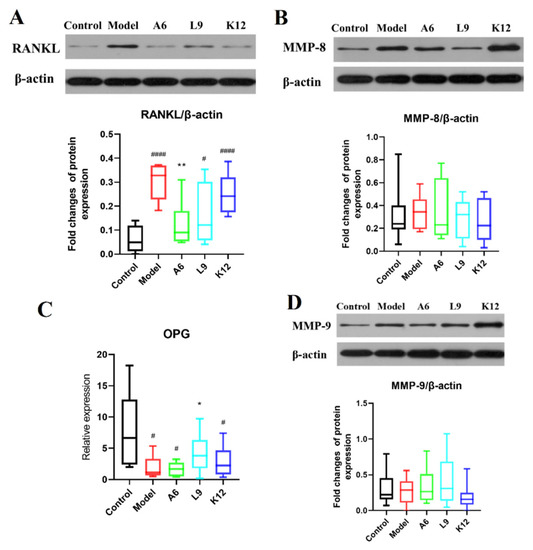 The modulating effect of A6 or L9 on protein expression levels of key biomarkers in gingival tissues. (A,B,D) Representative analysis and densitometric quantification of Western immunoblot bands. (C) Relative expression of OPG as determined by RT-PCR. Values designated with a superscript * reflect comparisons with the model group, and values with a # are in relation to the control group (* p and # p < 0.05; ** p < 0.01; #### p < 0.0001).