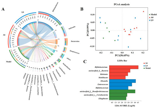 Statistical analysis of similarity (ANOSIM) demonstrated that the taxonomic composition was significantly different after L9 and A6 intervention compared with the model group (p < 0.05). We further performed PCoA and LEfSe analyses among the three groups to investigate periodontal microbiotal differences after L9 and A6 intervention, and our PCoA depicted a distinct distribution with respect to distances for the three groups (Figure 5B), implying a significant difference in bacterial community composition. When we used LEfSe analysis to estimate species effect size per group with regard to differential effects, we identified 10 characteristic taxa at the genus level and observed that Desulfovibrionaceae, Coriobacteriia, and Ellagibacter were discriminative for the model group; Olsenella, Enterococcus, and Bifidobacterium were discriminative for the L9 group; and Bifidobacterium, unclassified_d__Bacteria, Ralstonia, and Motilibacter were discriminative for the A6 group (LDAs > 2.5) (Figure 5C).