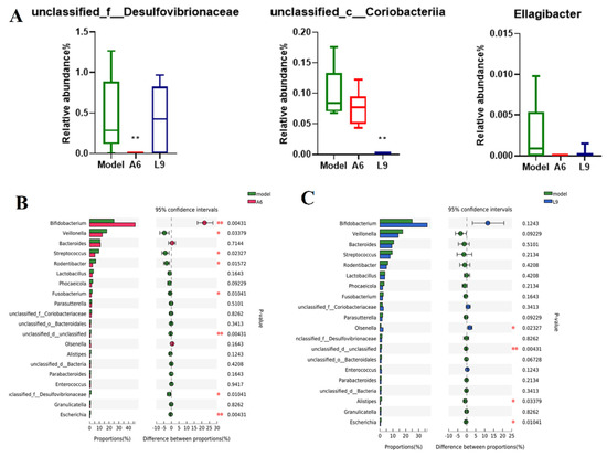 Effects of A6 and L9 administration on abundance changes in characteristic taxa at the genus level. (A) Characteristic taxa derived from LEfSe analysis. (B) Difference comparisons of species abundances between A6 and model groups using the Wilcoxon-Mann-Whitney U test. (C) Difference comparisons of species abundances between L9 and model groups using Wilcoxon rank-sum/Mann-Whitney U test (* p < 0.05, ** p < 0.01).