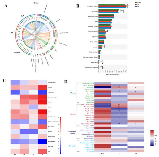 Effects of A6 or L9 administration on species virulence factor functions in PD-model mice. (A) The sample and species function Circos diagram shows the abundance correspondence between sample and virulence factor function. (B) Multigroup comparison diagram of virulence factor function depicting the significance of the functional abundances of virulence factors among different groups. (C) Correlation heatmap showing four clinical PD indices and species virulence factor functions. (D) Comparison of top 10 virulence factor differences in adherence, invasion, exoenzyme, and complement protease functions (* indicates the differences between probiotic and model groups; * p < 0.05, ** p < 0.01, *** p < 0.001).