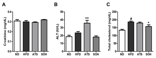 Blood creatinine concentrations were 0.31 ± 0.001 mg/dL in the ND group, 0.30 ± 0.001 mg/dL in the HFD group, 0.29 ± 0.001 mg/dL in the ATS group, and 0.32 ± 0.001 mg/dL in the SOH group. The creatinine levels did not differ significantly between groups (Figure 5A). Blood ALT concentrations were 23.20 ± 1.86 IU/L in the HFD group, which showed slightly higher tendency, not statistically significant, than the 18.67 ± 1.76 IU/L in the ND group; it was 18.0 ± 1.54 IU/L in the SOH group, and ALT levels were approximately 22% lower, compared to the HFD group. ALT levels in the ATS group were 37.0 ± 3.69 IU/L, thus significantly higher than in the HFD group, by approximately 59% (Figure 5B). Total blood cholesterol was 191.50 ± 5.45 mg/dL in HFD mice, which was significantly higher than in ND mice (134.33 ± 5.81 mg/dL); it was 148.40 ± 10.68 mg/dL in SOH mice, which was significantly lower than in HFD mice, by approximately 22%. Cholesterol concentrations were 180.80 ± 5.68 mg/dL in ATS mice, which was slightly lower than in HFD mice by approximately 5% (Figure 5C).