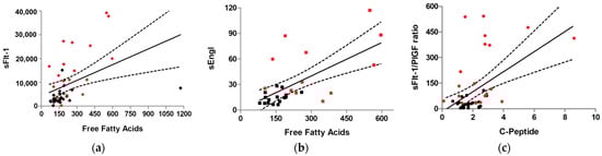 Linear regression with 95% confidence interval for prediction of angiogenic factor elevation (p < 0.05): (a) Elevation of free fatty acids (FFA) was a predictor for elevation of soluble fms-like tyrosine kinase-1(sFlt-1) (b) and soluble endoglin(sEng) (c) C-peptide was a predictor for high sFlt1/PlGF ratio. The control group is represented in black; the preeclampsia group is shown in red. The units of measurement for these parameters were: FFA (mg/dL), sFlt-1 (pg/mL), sEng (ng/mL), C-peptide (ng/mL). PIGF: placental growth factor.