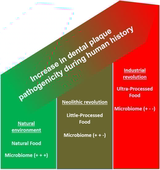 It seems unsurprising that these changes also had a severe impact on the oral microbiome and dental plaque. Adler et al. were able to display this transformation (from pre-Neolithic times to the Neolithic and Industrial Revolution) by microbiological analysis of calcified plaque from different points in time of human evolution []. They were able to show a dramatic increase of caries and periodontitis-related strains (S. mutans and P. gingivalis) from hunter-gatherer to modern times. This is in line with the enormously high prevalence of caries and periodontitis in modern industrialized countries. Furthermore, the data demonstrated a shift from a highly diverse biofilm with proportions of the phylum Firmicutes and unclassified bacteria in hunter-gatherer times to a less diverse biofilm with high proportions of the phylum Proteobacteria.