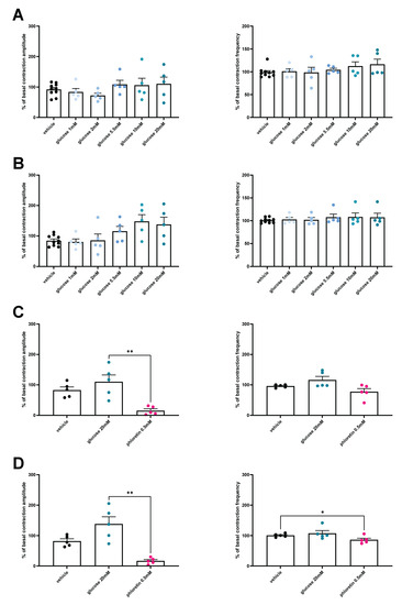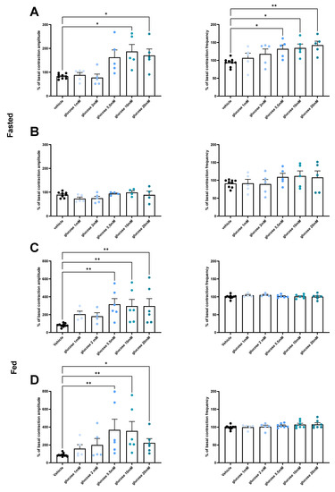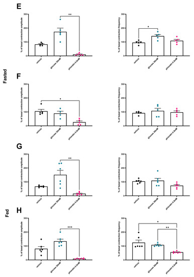 In fed conditions, both duodenum and jejunum showed an increase in contraction amplitude after glucose stimulation, while frequencies were unaffected. Furthermore, the stimulatory effect also starts for a 5.5 mM concentration of glucose, without any additional effect of a higher dose (Figure 2C,D).