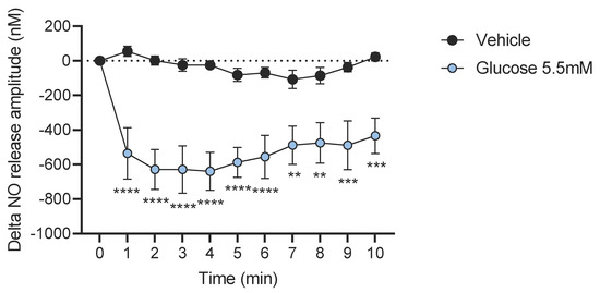 Neuronal cell cultures were removed, and cells were washed twice with Krebs–Ringer bicarbonate/glucose buffer (pH 7.4) in 95% O2 and 5% CO2. Before the experiment, the medium was changed and after a 10 min recovery period, the spontaneous NO release was measured at 37 °C for 5 min in culture wells by using a specific amperometric probe (ISO-NOPF, 100 μm diameter, 5 mm length, World Precision Instruments, Aston Stevenage, UK) in response to glucose concentrations of 5.5 mM. For NO measurement, 2 mice were needed per well to have one point. A total of 22 mice (10 for control and 11 for glucose-treated cells) were used for this experiment.