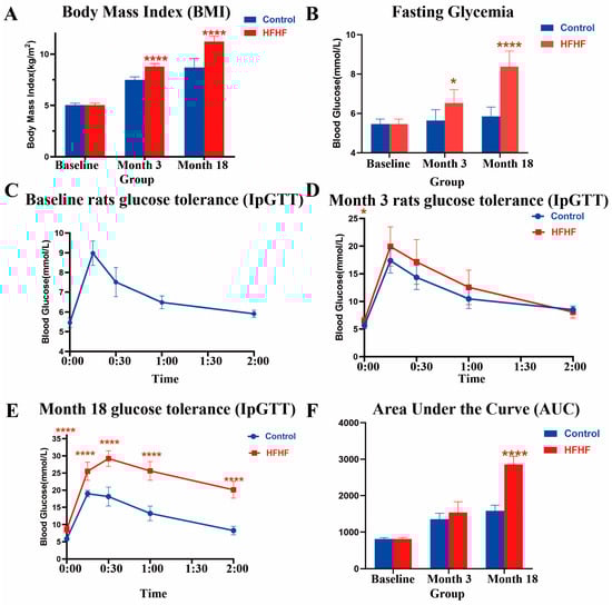 BMI, fasting glucose, and glucose tolerance measured in this study. (A) The body mass index (BMI) in this study for the normal diet (control, blue) and high-fat, high-fructose diet (HFHF, red) groups. (B) Evolution of fasting glycemia. (C–E) Evolution of glucose tolerance measured via the intraperitoneal glucose tolerance test (IpGTT) in all groups at the beginning (baseline) and after 3 (month 3) and 18 (month 18) months of feeding. (F) The area under the curve (AUC) during the IpGTT. Results are shown as the mean ± SD. * Significant results versus the age-matched control group: * p < 0.05, **** p < 0.0001.