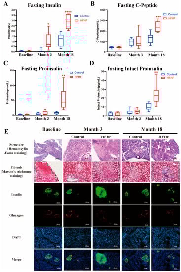 Structural and function changes of the pancreas in this study. (A–D) Fasting plasmatic insulin, C-peptide, proinsulin, and intact proinsulin levels during the study for the normal diet (control, blue) and high-fat, high-fructose diet (HFHF, red) groups at the beginning (baseline) and after 3 (month 3) and 18 (month 3) months of feeding. Results are shown as the mean ± SD. * Significant results versus the age-matched control group: * p < 0.05, ** p < 0.01, *** p < 0.001, **** p < 0.0001. (E) Changes in islets were visualized using hematoxylin/eosin staining, Masson’s Trichrome staining, and insulin and glucagon immunofluorescence staining at the beginning (baseline) and after 3 (month 3) and 18 (month 18) months of normal (control) and high-fat, high-fructose (HFHF) diet feeding. Scale bar = 100 μm.