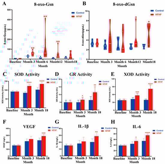 Changes in oxidation and inflammation levels during this study. Evolution of 8-oxo-Gsn (A) and 8-oxo-dGsn (B) during the study for the normal diet (control, blue) and high-fat, high-fructose diet (HFHF, red) groups. Results are shown as the median (interquartile range). (C,D) Effects of diet on SOD (C), GR (D), and XOD (E) activity at the beginning (baseline) and after 3 (month 3) and 18 (month 18) months of control and HFHF diet. (F–H). Effects of diet on VEGF (F), IL-1β (G), and IL-6 (H) during the study at the beginning (baseline) and after 3 (month 3) and 18 (month 18) months of treatments. Results are shown as the mean ± SD. * Significant results versus the age-matched control group: * p < 0.05, ** p < 0.01, *** p < 0.001, **** p < 0.0001.