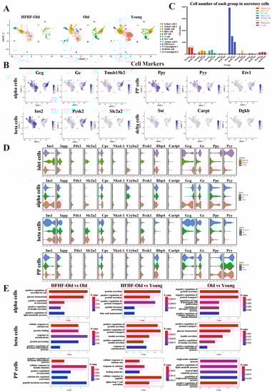 Distinct cell populations with transcriptional signatures in secreting islet cells. (A) UMAP plot characterizing the differences in secretory cell subpopulation distribution at the beginning (young) and after 18 months (HFHF-old, old) of diet feeding. Each point represents one cell. The distance between the two points is determined by the Pearson correlation of the 500 most highly expressed genes in each cell. Cell identity is recognized by the expression of marker genes. (B) UMAP plot of the marker gene expression in four types of islet cells. (C) The number of different pancreatic secretory cells at the beginning (young) and after 18 months (HFHF-old, old) of diet feeding. (D) Violin diagram characterizing the marker genes expression level in islet alpha, beta, and PP cells at the beginning (young) and after 18 months (HFHF-old, old) of diet feeding. (E) GO terms of upregulated secretory function-related enrichment obtained in islet alpha, beta, and PP cells after pairwise comparison of three groups (p < 0.05).