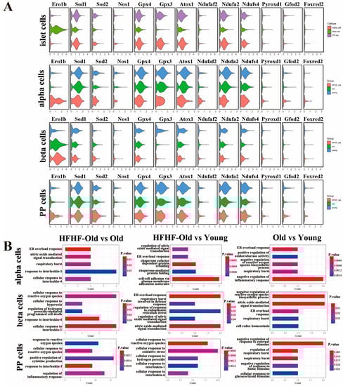 Distinct expression of oxidative-related oxidoreductase genes and Gene Ontology (GO) analysis findings among three groups. (A) Violin diagram characterizing the expression of oxidoreductase genes in islet alpha, beta, and PP cells at the beginning (young) and after 18 months (HFHF-old, old) of diet feeding. (B) GO terms of upregulated OS and inflammation-related enrichment obtained in islet alpha, beta, and PP cells after a pairwise comparison of three groups (p < 0.05).