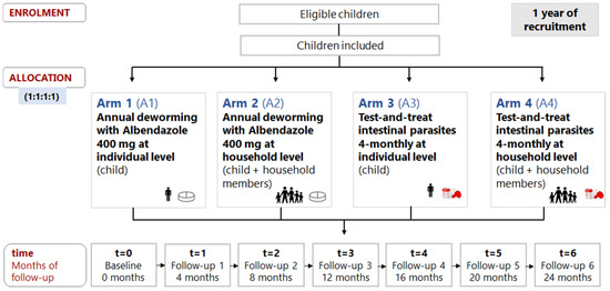 - Arm 4 (A4): four-monthly test-and-treat approach to intestinal parasites at the household level (4TT*household level).