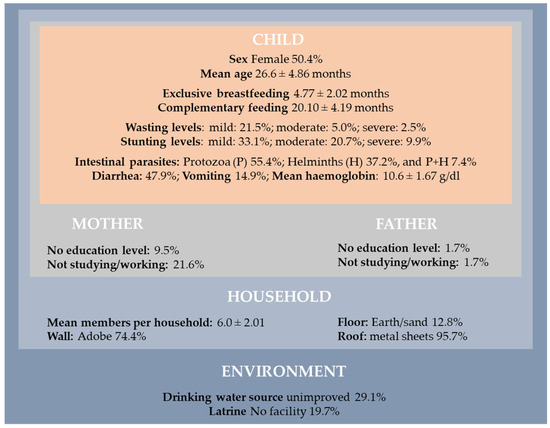 A detailed analysis of the baseline characteristics is provided in our original study [21]. Here, an overall description is presented to highlight the health and living conditions of the 121 children included at baseline (Figure 2).
