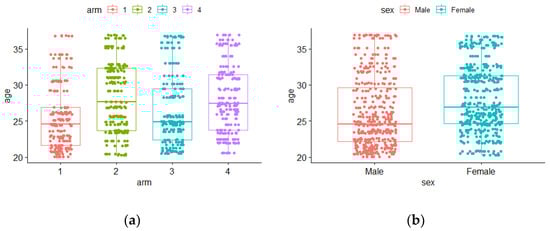 In arms A1 and A3, the median age values seemed to be lower when compared with A2 and A4 (Figure 3a). An empirical difference in median age also occurred between males and females, with females having a higher median age (Figure 3b). Nevertheless, the hypothesis tests previously used did not show significant differences [21]. In this work, by applying binary longitudinal models, the effects of these variables (age, sex, arm, and all of them introduced simultaneously) on stunting and/or wasting status could be revealed (or not).
