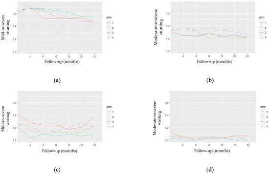 Observed stunting and wasting profiles by arm: (a) mild-to-severe stunting; (b) moderate-to-severe stunting; (c) mild-to-severe wasting; (d) moderate-to-severe wasting.