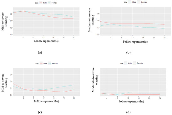 Figure 5 presents the observed stunting (Figure 5a,b) and wasting (Figure 5c,d) profiles by sex. As shown in Figure 5a,b, there seemed to be a distinction in the stunting curves between males and females after the fourth month of follow-up (Fu1). More specifically, the proportion of mild-to-severe stunting became higher in female than in male children after Fu1, while moderate-to-severe stunting levels were still more frequent in male children. Mild-to-severe wasting (Figure 5c) began higher in male children until the fourth month, when an inversion of the curves occurred. After 12 months of follow-up (Fu3), the proportion of mild-to-severe wasting seemed to increase in female children. Regarding Figure 5d, a smaller distinction between males and females with moderate-to-severe wasting was observed.