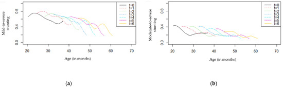 Stunting profiles by age and follow-up (t = 0,1,2,3,4,5,6): (a) mild-to-severe stunting; (b) moderate-to-severe stunting.