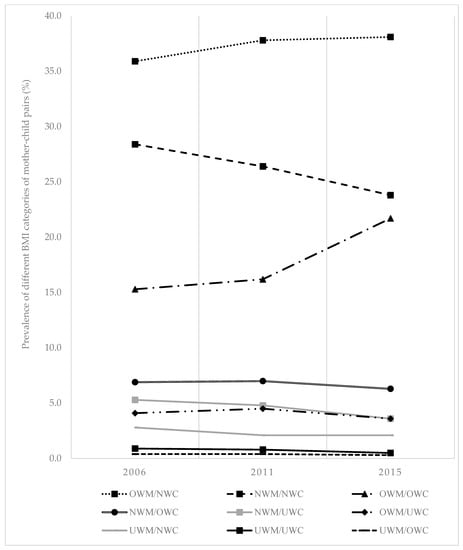 In the year 2006, the prevalence of OWM/OWC in this study was 15.3%, which was lower than the overweight mother–child pairs reported in Croatia (25.3%) over the same period []. A decade later, the prevalence of OWM/OWC in the 2015 survey (21.7%) was found to be higher than the findings reported in other developing countries, such as Colombia (12.4%), China (13.4%), Samoa (16.9%) and India (20.7%) [,]. However, the prevalence of OWM/OWC found in our study was lower in comparison to that reported in South Africa (22.4%), Brazil (28.4%) and Mexico (40.0%) [,].