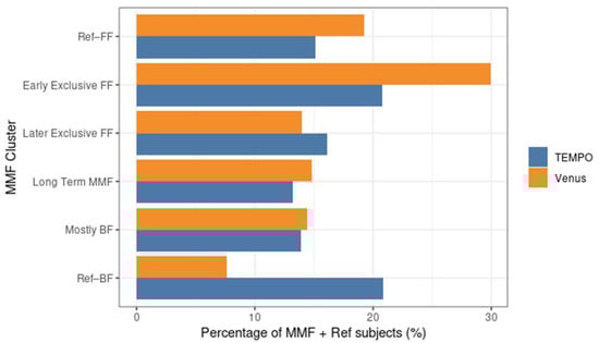 Percentage of subjects in different MMF clusters and reference groups in the MMF + Ref population for Tempo and Venus. FF: formula feeding; BF: breastfeeding; MMF: Mixed milk Feeding; Ref–BF: Subjects who had no, or limited infant milk formula intake recorded during the first year (on ≤5% of total recorded days).