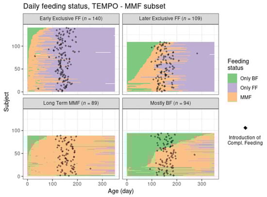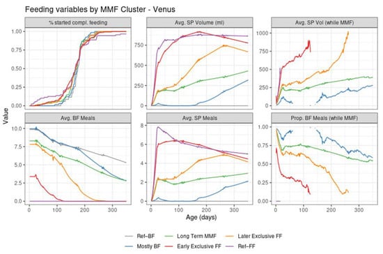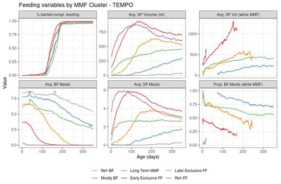 The introduction of complementary feeding (Figure 3, top left of graph) occurs slightly earlier in the formula-intensive clusters (median age of 140 in early exclusive FF, 145 in Ref–FF, and 148 in the later exclusive FF compared to 159 days in mostly BF and 167 days in Ref–BF). This is detailed in the Supplementary Materials (Table S1 and Figure S4).