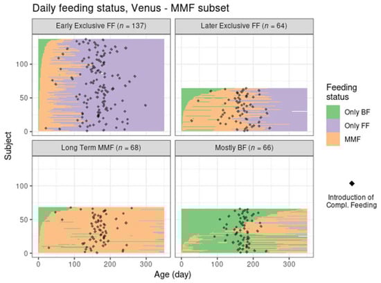 Subjects who had no or limited infant milk formula intake recorded during the first year (on ≤5% of total recorded days) were labelled as “Ref–BF”. Subjects who had no or limited breast milk intake recorded during the first year (on ≤5% of total recorded days) were labelled as “Ref–FF”. Subjects that were not part of the MMF subset or the two reference groups were labelled as “short transition”, as they typically showed transitions between BF and exclusive FF shorter than 3 weeks. This is illustrated in the Supplementary Materials (Figure S1). The resulting split is shown in Table 1.
