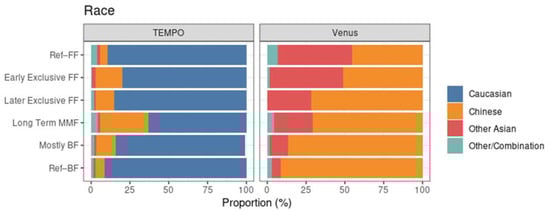 In terms of race, the two studies were markedly different. In TEMPO, the MMF subset has a lower proportion of Caucasian subjects compared to the reference groups, the clearest example being the long-term MMF cluster (Figure 6, left). In Venus, the clusters with more BF had a higher proportion of Chinese subjects (Figure 6, right).