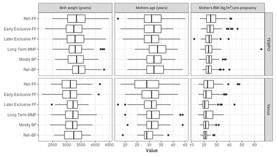For birth weight, maternal weight, and maternal BMI pre-pregnancy, there did not appear to be large differences among clusters. However, the average birth weight was, overall, lower for the subjects from Venus, likely due to the substantially larger proportion of Asian subjects, who are known to be lighter at birth than Caucasian infants [29,30,31]. Ref–FF was the group with the highest maternal BMI pre-pregnancy in both TEMPO and Venus, while the birth weight was highest in the Ref–BF reference group. MMF mothers tended to be older than mothers in the reference groups in Venus, while long-term MMF mothers were older compared to the MMF average in TEMPO (see Figure 7).