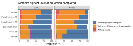 Distribution of mothers’ highest level of education completed within each MMF cluster for TEMPO (left) and Venus (right).