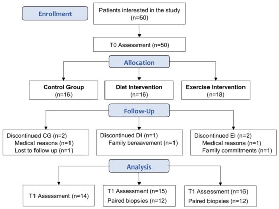 Of the 50 participants enrolled in the study, 45 completed the study (CG, n = 14; DI, n = 15; EI, n = 16; Figure 1). At baseline, these participants were well matched with no differences in clinical and histological characteristics (Table 1).