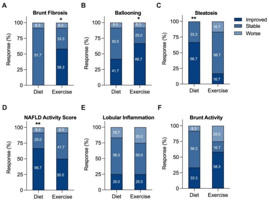 Changes in histologic categories (improved, stable, or worse) after a 12-week diet or exercise intervention. Any increase or decrease in score was considered a change in category. (A) Fibrosis, (B) ballooning, (C) steatosis, (D) NAFLD activity, (E) lobular inflammation, and (F) Brunt activity scores. The percent of patients in each category are shown numerically within each category of the bar graph. * p <0.05, ** p <0.01 from baseline, Wilcoxon matched pairs signed-rank test.
