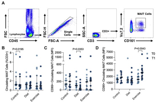 Circulating MAIT cells before (T0) and after (T1) diet or exercise intervention. (A) Representative flow cytometry dot plots showing gating strategy for defining circulating CD3+ Vα7.2hi CD161hi MAIT cells. (B) Circulating MAIT cells in control participants (n = 11, as 3 participant samples were lost during processing), and participants completing either 12 weeks of dietary (n = 15) or exercise (n = 15) intervention. (C) CD69+ and (D) CD95+ circulating MAIT cells before and after intervention. Data were analysed via Wilcoxon matched pairs signed-rank test, and individual values and median ± interquartile range are depicted. MFI: median fluorescence intensity. MAIT: Mucosal-associated invariant T.
