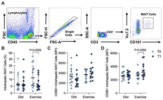 Only a limited number of studies have examined circulating MAIT cells in response to exercise. Circulating MAIT cells have been shown to increase in response to both an acute graded exercise test to volitional exhaustion [40], and a 40 min submaximal test [41], although MAIT cell numbers rapidly return to baseline within an hour [41]. Exercise training in breast cancer survivors improved responsiveness of MAIT cells observed after 45 min of intermittent cycling, although not to the level observed in healthy older women [42]. Both acute and chronic exercise programs have been shown to influence the immune system [43,44]. Although the heavy exercise workloads of competitive athletic training have been associated with inflammatory immune effects, regular (moderate) exercise training has an anti-inflammatory effect that is believed to have a summative effect over time in cardiometabolic disease and cancer prevention [45]. Obtaining paired liver biopsies is not trivial and likely explains why these are the first data examining intrahepatic MAIT cells in response to lifestyle intervention in NAFLD.
