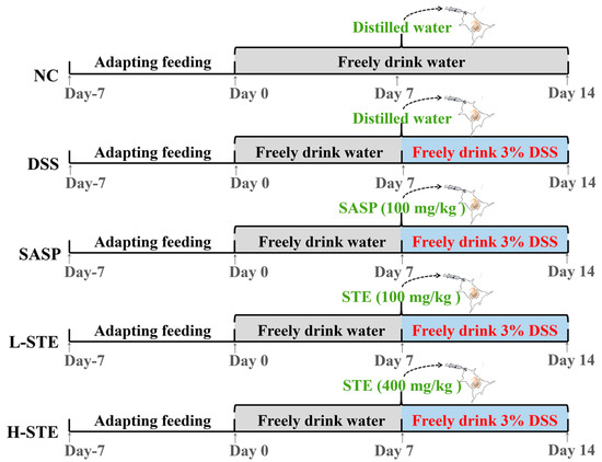Schematic representation of the experimental design. NC, normal control group; MC, DSS-induced UC model group; SASP, suffasalarin intervention group at the dose of 100 mg/kg; L-STE, STE intervention group at the dose of 100 mg/kg; H-STE, STE intervention group at the dose of 400 mg/kg.