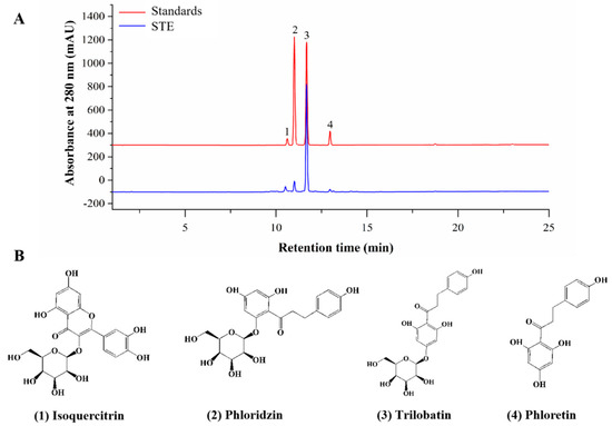 The TPC and TFC of STE were 200.68 ± 5.68 mg GAE/g DW and 38.95 ± 0.43 mg CE/g DW, respectively. In addition, the chromatograms of standards and STE and the identified components in STE are shown in Figure 2. A total of four active compounds were identified, of which trilobatin (215.23 ± 6.63 mg/g) showed the highest content, followed by phloridzin (48.99 ± 4.43 mg/g), phloretin (24.29 ± 3.43 mg/g), and isoquercitrin (10.22 ± 1.68 mg/g).