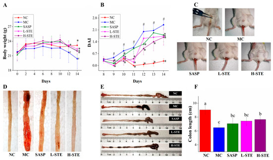 Effects of STE on disease symptoms of DSS-induced ulcerative colitis mice. (A) Body weight. (B) DAI scores during DSS treatment. (C) Typical images of hematochezia. (D) Typical images of colonic tissue bleeding. (E) Representative images of colon length. (F) Colon length. Values are expressed as the mean ± the SD (n = 10). # p < 0.05 compared to the NC group; * p < 0.05 and ** p < 0.01 compared to the MC group. Bars with different lowercase letters represent significant differences (p < 0.05).